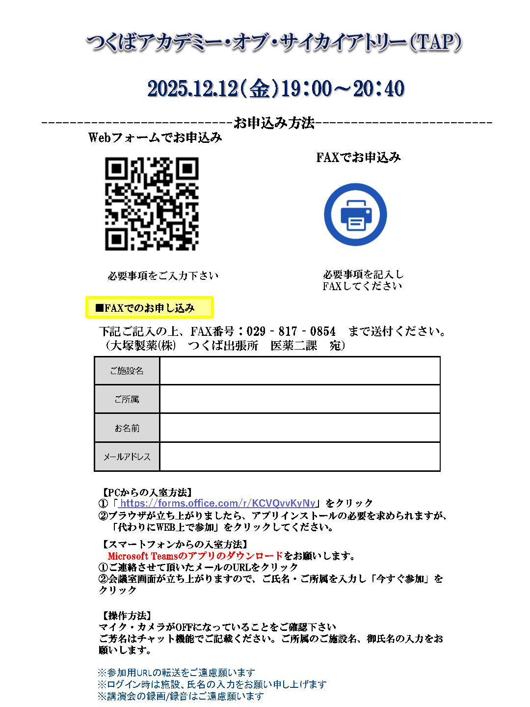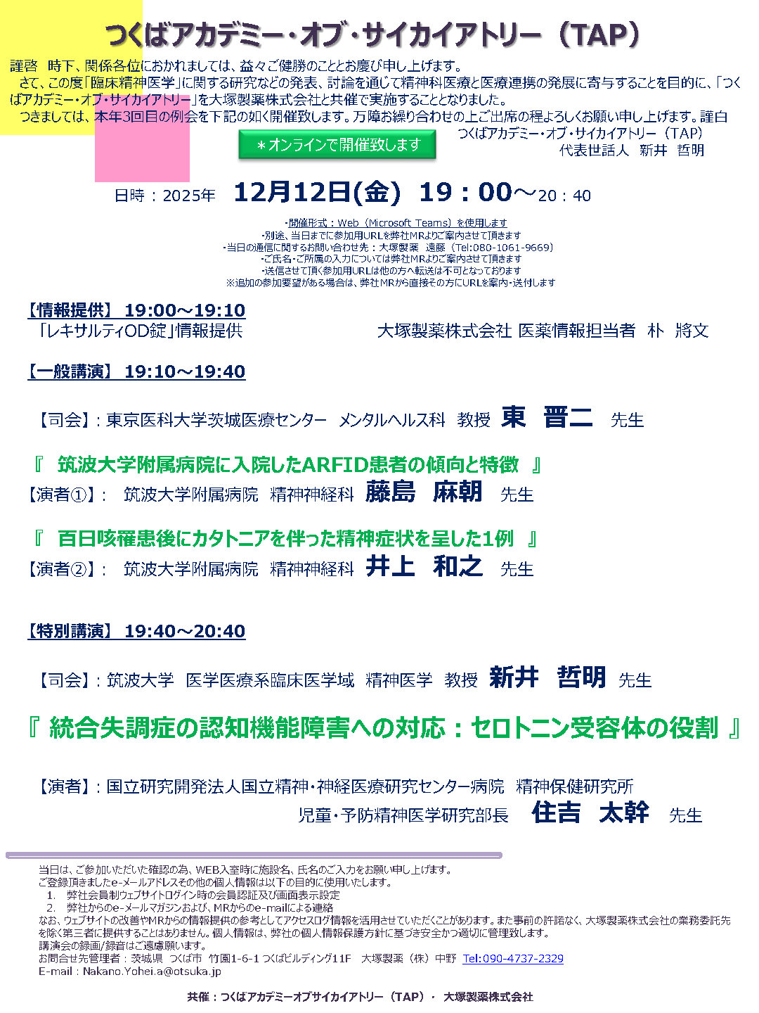 2025年12月12日(金)TAPの会のご案内 By admin投稿日: 2025年12月4日カテゴリー: 2025年度、TAPの会 2025年12月12日(金)につくばアカデミー・オブ・サイカイアトリー(TAP)の会が開催されます。 皆様のご参加をお待ちしております。 今回もオンラインで開催いたします。