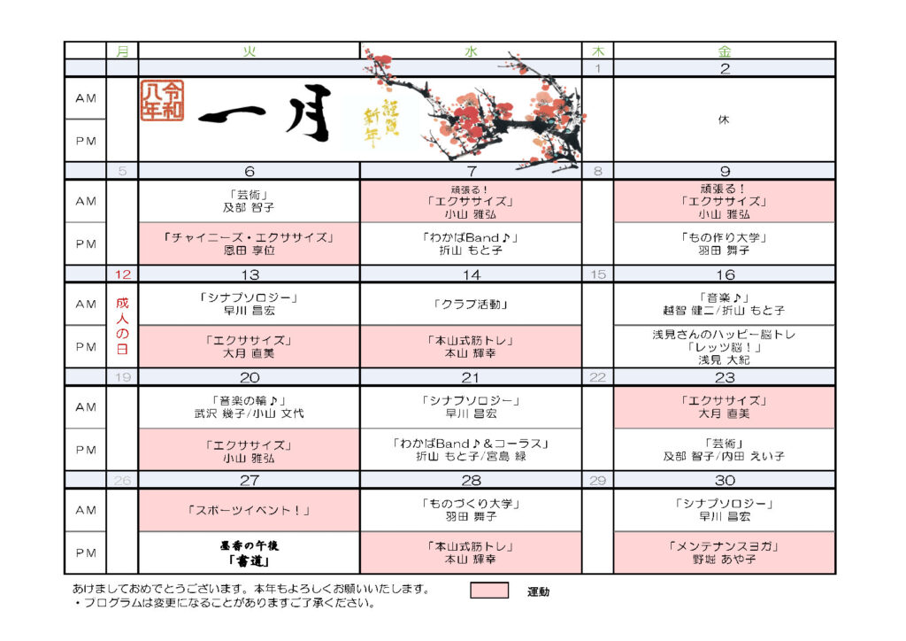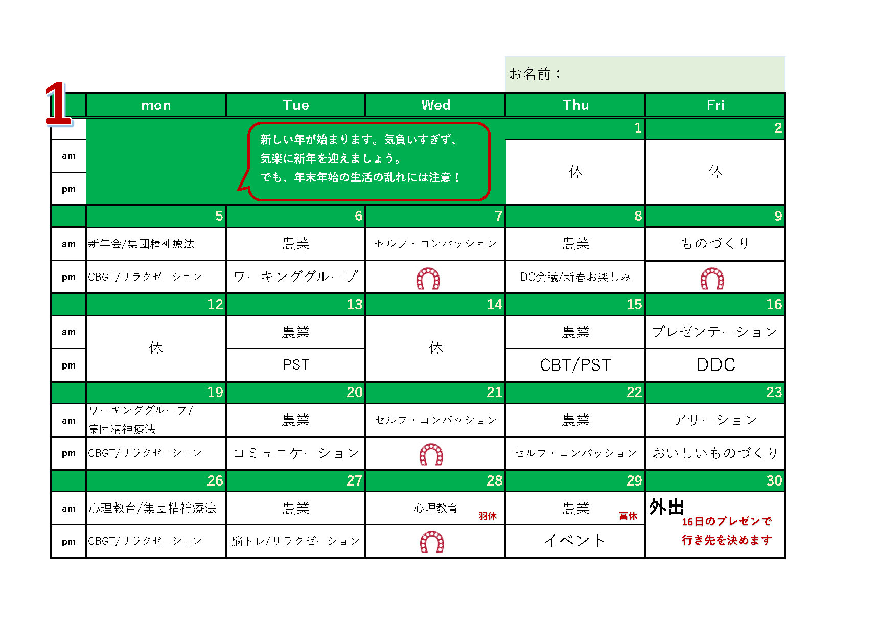 デイケアプログラム 1月 By admin投稿日: 2025年12月16日カテゴリー: 2025年度、デイケア 認知力アップおよびリワークデイケアの1月のプログラムです。 感染予防対策を行いながら、活動を行っています。 【認知力アップ】 【リワーク】