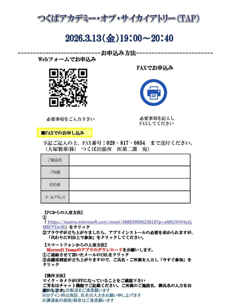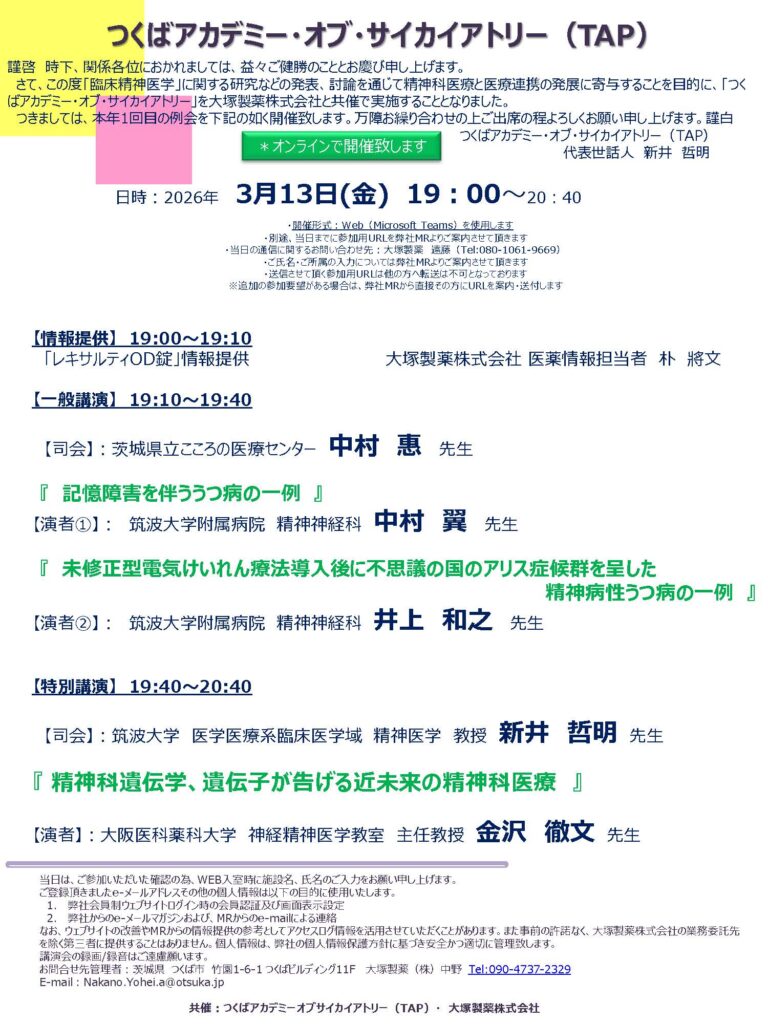 2026年3月13日(金)TAPの会のご案内 By admin投稿日: 2026年3月6日カテゴリー: 2025年度、TAPの会 2026年3月13日(金)につくばアカデミー・オブ・サイカイアトリー(TAP)の会が開催されます。 皆様のご参加をお待ちしております。 今回もオンラインで開催いたします。