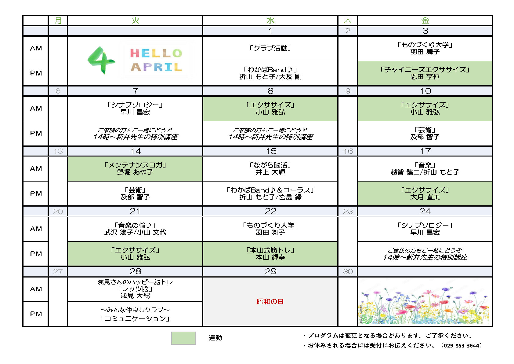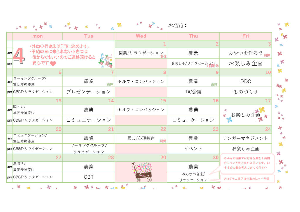 デイケアプログラム 4月 By admin投稿日: 2026年3月25日カテゴリー: 2026年度、デイケア 認知力アップおよびリワークデイケアの4月のプログラムです。 感染予防対策を行いながら、活動を行っています。 【認知力アップ】 【リワーク】
