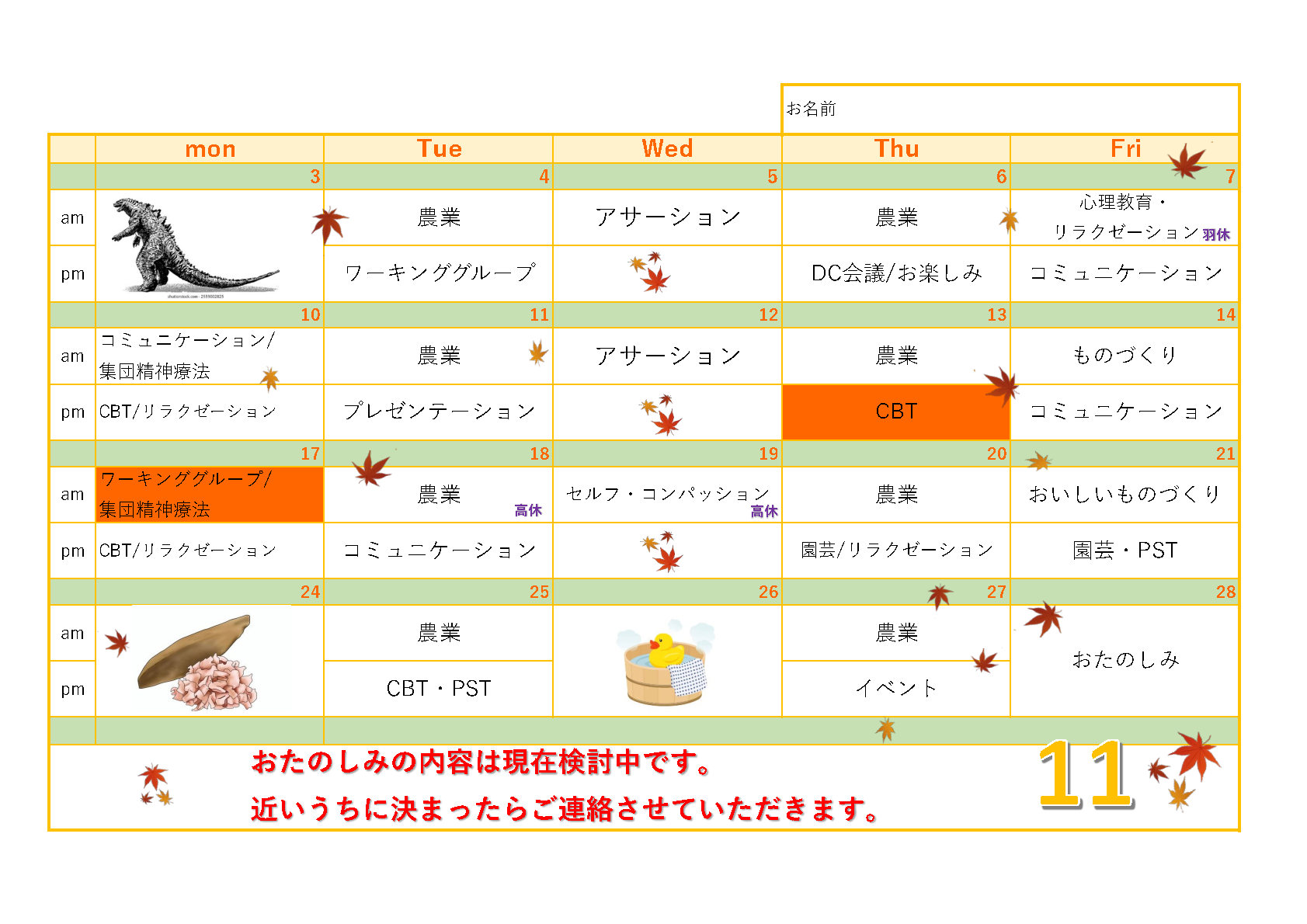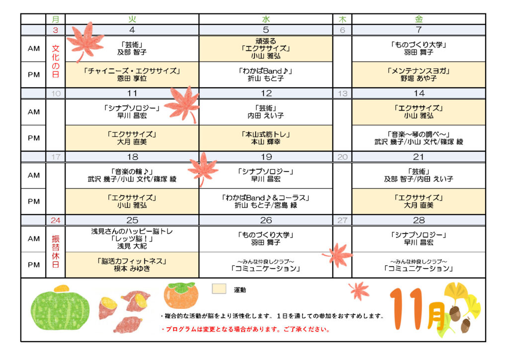 デイケアプログラム 11月 By admin投稿日: 2025年10月27日カテゴリー: 2025年度、デイケア 認知力アップデイケアおよびリワークデイケアの11月のプログラムです。 感染予防対策を行いながら、活動を行っています。 【認知力アップ】 【リワーク】
