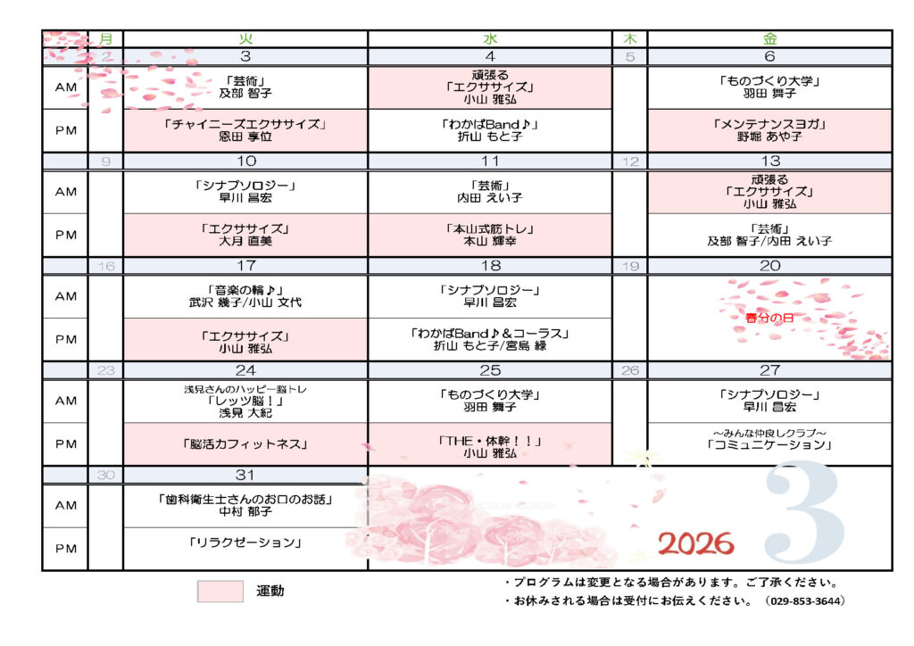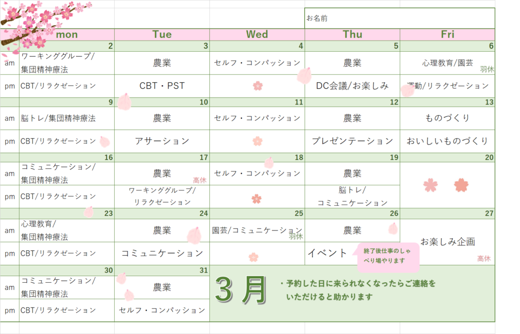 デイケアプログラム 3月 By admin投稿日: 2026年2月24日カテゴリー: 2025年度、デイケア 認知力アップおよびリワークデイケアの3月のプログラムです。 感染予防対策を行いながら、活動を行っています。 【認知力アップ】 【リワーク】